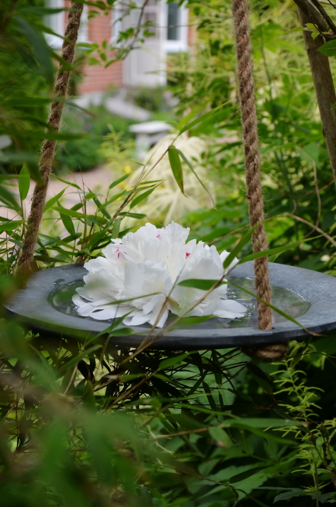 Jag hängde upp det fina fågelbadet från Eldgarden bredvid bambun i en gren från Paradisträdet.